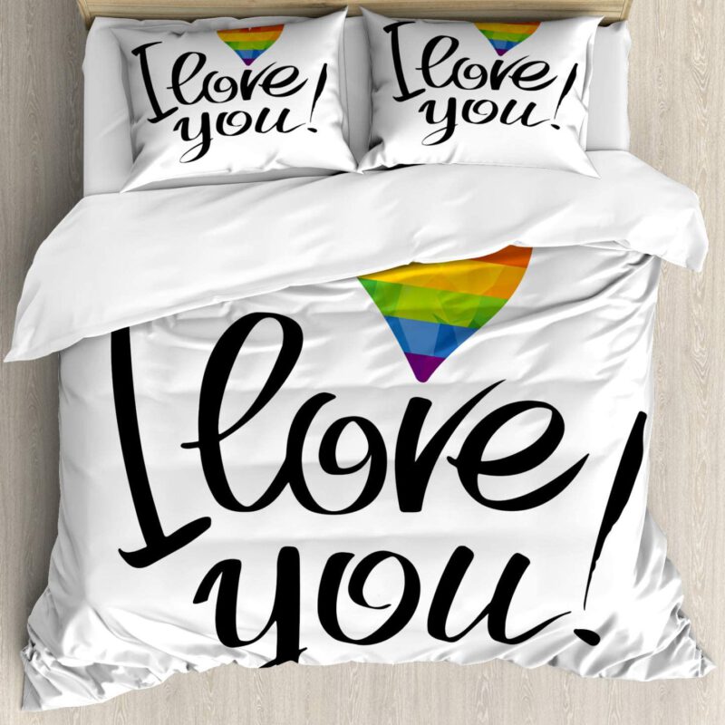 Ambesonne Pride Duvet Cover Set, I Love You Letters with Polygonal Effect Rainbow Color Heart Gay Lesbian Couples, Decorative 3 Piece Bedding Set with 2 Pillow Shams, Queen Size, Black Rainbow